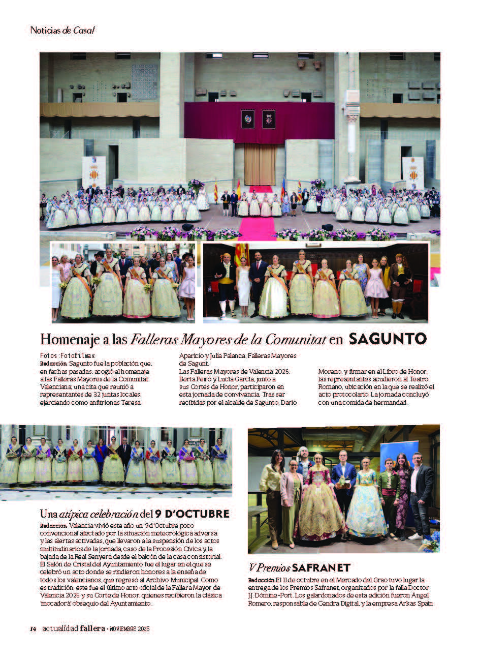 - Homenaje a las Falleras Mayores de la Comunitat en Sagunto. Una atípica celebra-ción del 9 d’Octubre. V Premios Safranet.